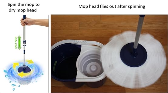 When using, you pour water in the bucket; then put the mop head in the bucket. For the next step, you move the mop to the wringing part. Just use your hand to push the handle several times; the head will be dried immediately.